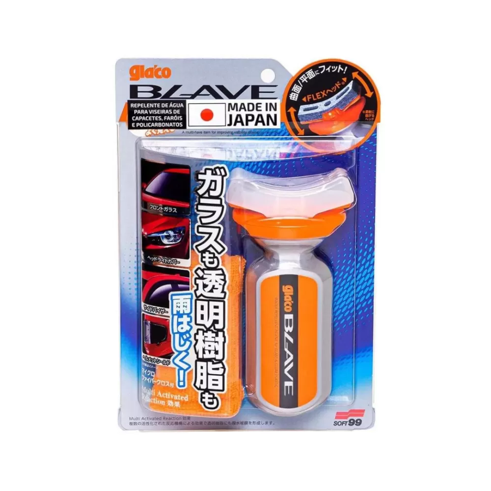 Glaco Blave é produto da linha GLACO indicado para cristalização de plásticos, acrílicos e policarbonatos. Proporciona resultado de repelência acima da média na superfície, melhorando a visibilidade do motorista e garantindo mais segurança ao dirigir. Indicado para viseiras de capacetes, faróis, lanternas traseiras, etc. Pode ser aplicado em aeronaves como helicópteros e aviões. Possui um aplicador embutido que facilita a aplicação, pois se molda tranquilamente a diversos ângulos e superfícies. Glaco Blave pode ser aplicado também em vidros.