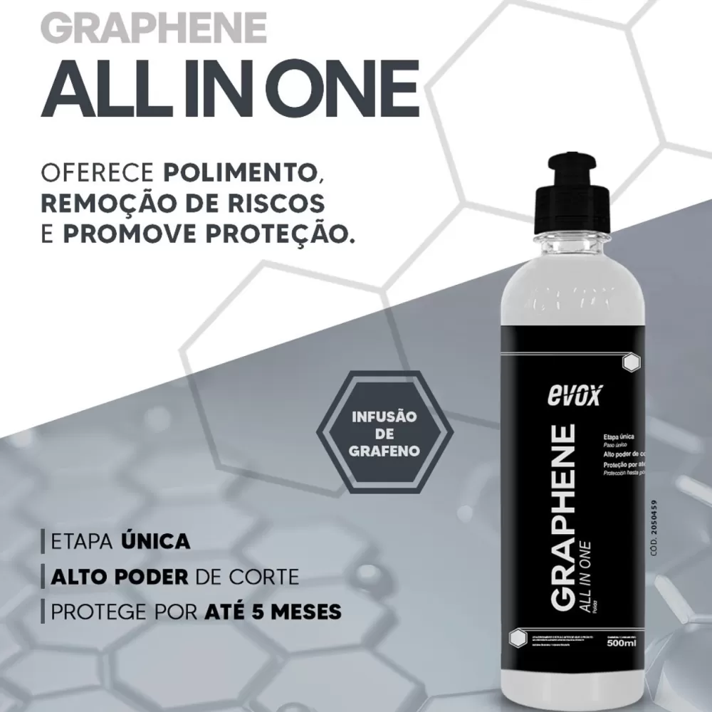 EVOX GRAPHENE ALL IN ONE 500ML, a solução definitiva para proteção e brilho automotivo em um único produto. Com tecnologia avançada de grafeno, oferece alta durabilidade e resistência contra riscos, agentes químicos e intempéries, garantindo uma camada protetora que potencializa o acabamento do seu veículo. Ideal para quem busca praticidade sem abrir mão da qualidade profissional.
