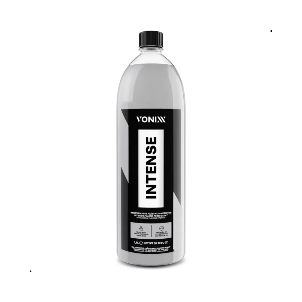 Intense é um renovador de plástico com proteção UV, cuja fórmula balanceada promove acabamento natural e toque seco, com durabilidade de 6 meses. O produto deve ser utilizado especificamente na parte interna do automóvel, em superfícies como vinil e plástico em geral.