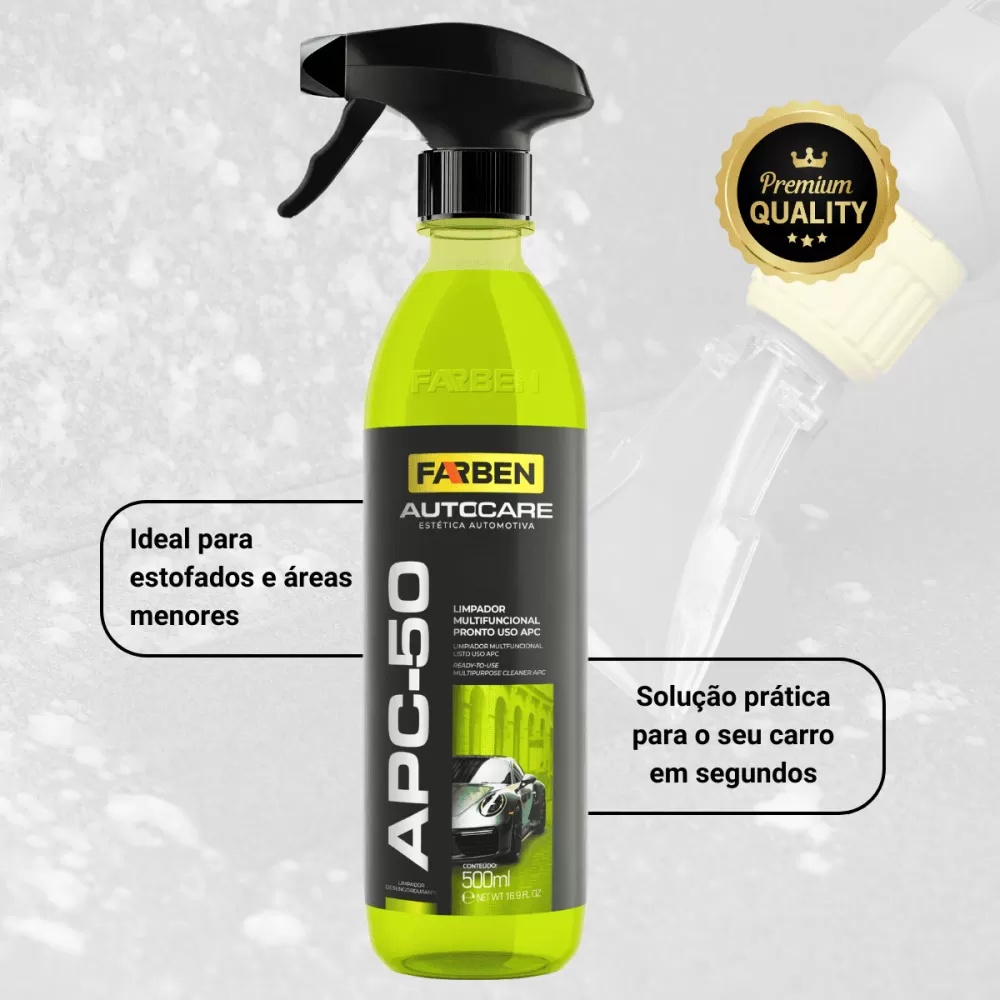 ✅ Apc-50 Limpador Multiuso 500ml Farben - É um limpador multifuncional pronto para uso da Farben, da linha AutoCare, pensado pra galera que faz detalhamento ou quer um “coringa” pra limpar tudo no carro/moto. A fórmula é biodegradável e segura, então além de limpar bem, é menos agressiva pro meio ambiente e pra maioria dos materiais laváveis. Ele já vem pronto, não precisa diluir, é só aplicar e começar a usar.