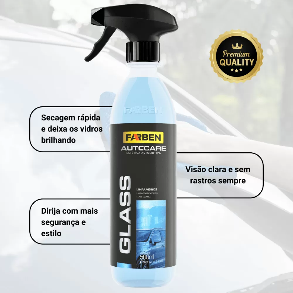 ✅ Glass Limpa Vidros Farben 500ML - Esse produto é feito pra limpar vidro automotivo e espelhos sem complicar. Ele é pronto uso, então não precisa diluir. Você aplica direto no vidro ou no pano de microfibra, espalha, remove sujeira e seca com um pano limpo. O resultado é transparência sem manchas ou efeito embaçado.