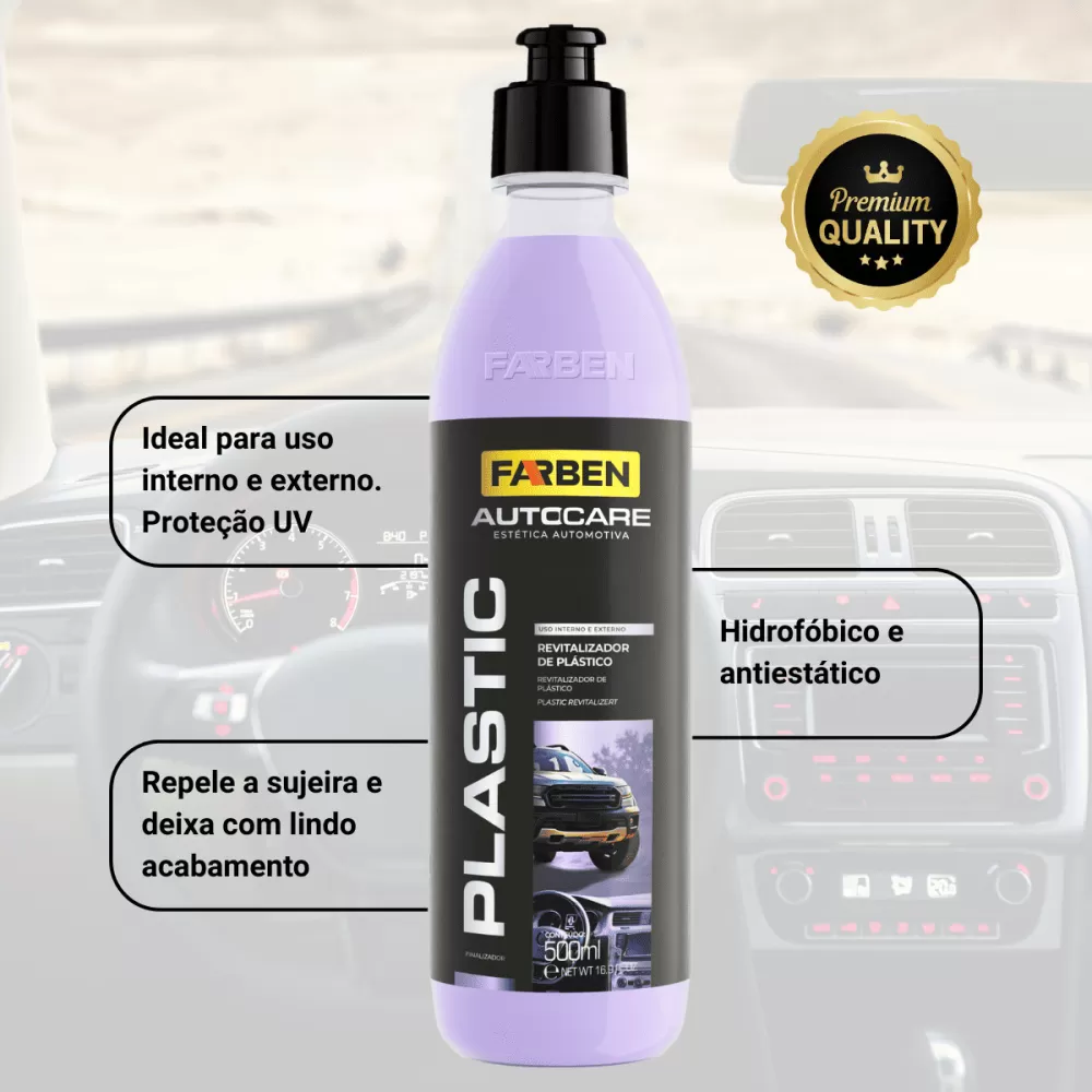 ✅ Farben Plastic Revitalizador de Plásticos 500 ml - Produto pra restaurar e proteger plásticos internos e externos do carro/moto. Ele devolve a cor original e dá um acabamento acetinado com toque seco, sem aquele aspecto oleoso que dá sujeira depois. Faz a peça ficar hidrofóbica (repelindo água) e antiestática (menos pó grudado) e ajuda a proteger contra o sol.