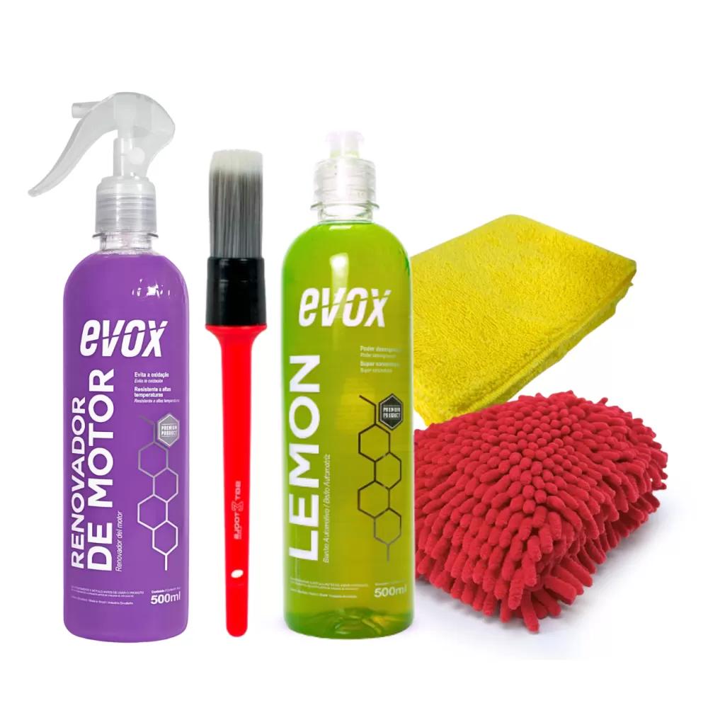 COMBO SHAMPOO PRE LAVAGEM LEMON 500ML + RENOVADOR MOTOR 500ML + MICROFIBRA + PINCEL + LUVA