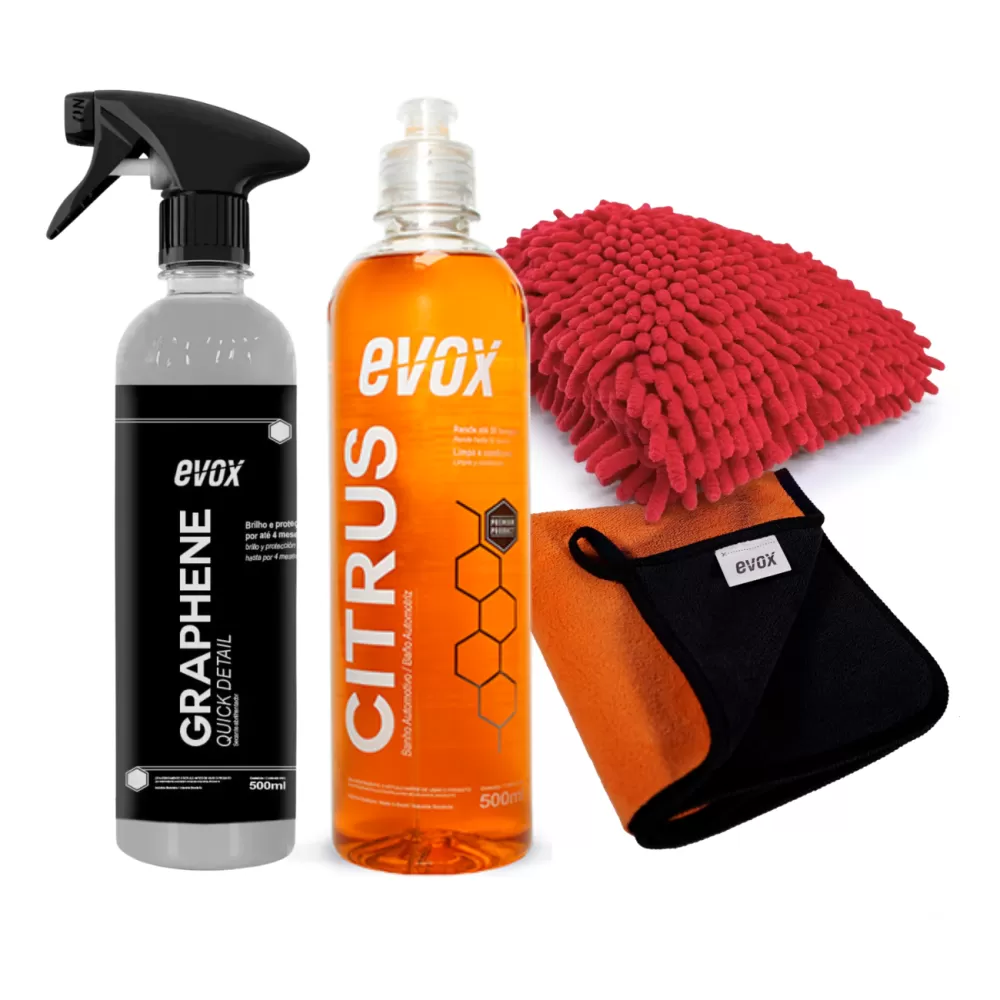 KIT BRILHO SHAMPOO CITRUS 500ML + QUICK GRAPHENE 500ML EVOX + MICROFIBRA 600GSM + LUVA