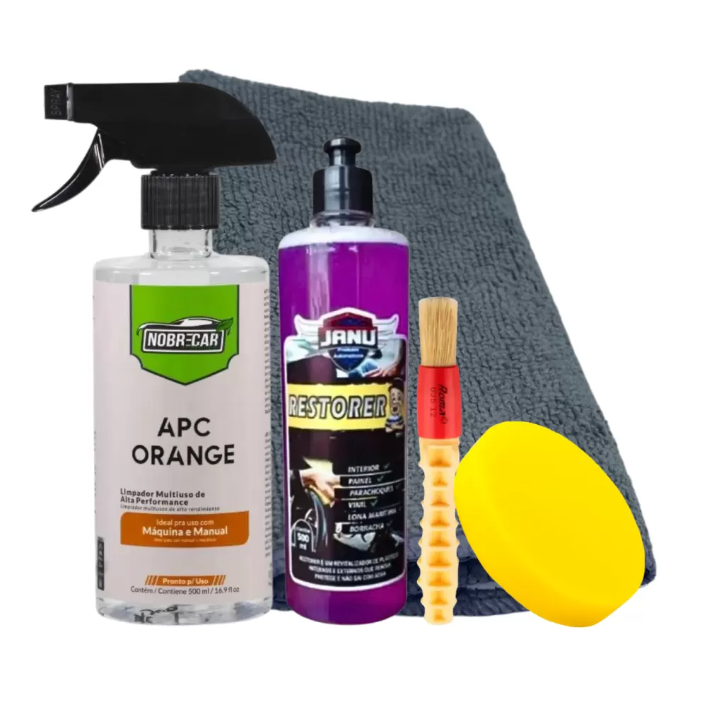 KIT RESTAURA PLASTICO INTERNO E EXTERNO - APC + RESTAURADOR + PINCEL + MICROFIBRA + APLICADOR
