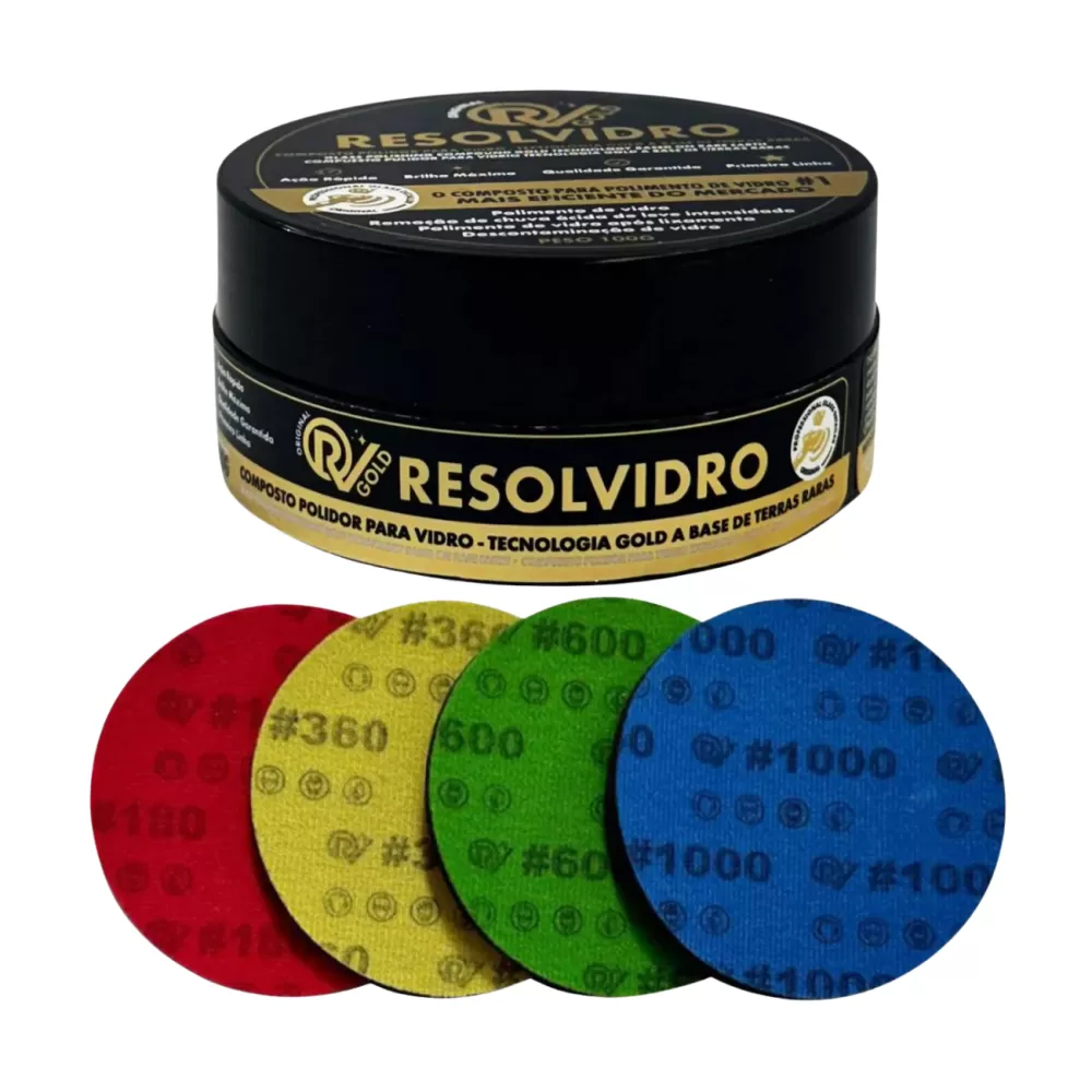 KIT COMPOSTO P/ VIDROS GOLD RESOLVIDRO 100g + LIXAS 6 POL