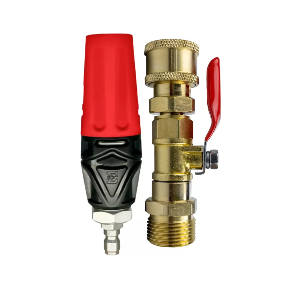 Registro de esfera de abrir e fechar (quando fechado aciona o funcionamento da função "stop total", desligando a lavadora) para conexão na mangueira original com adaptador de engate rápido fêmea para receber o bico curto.