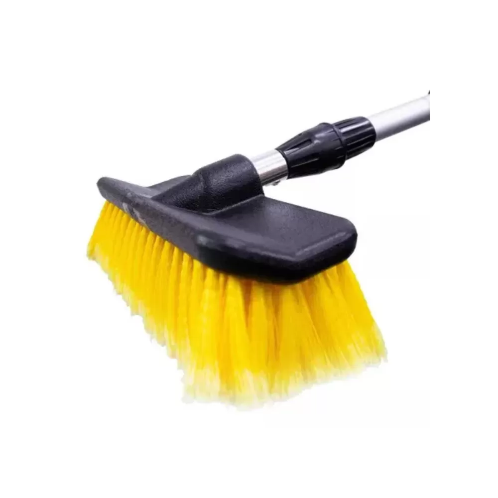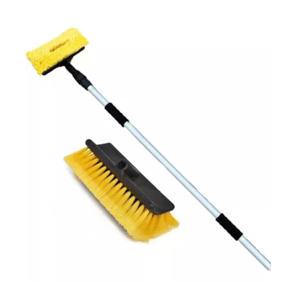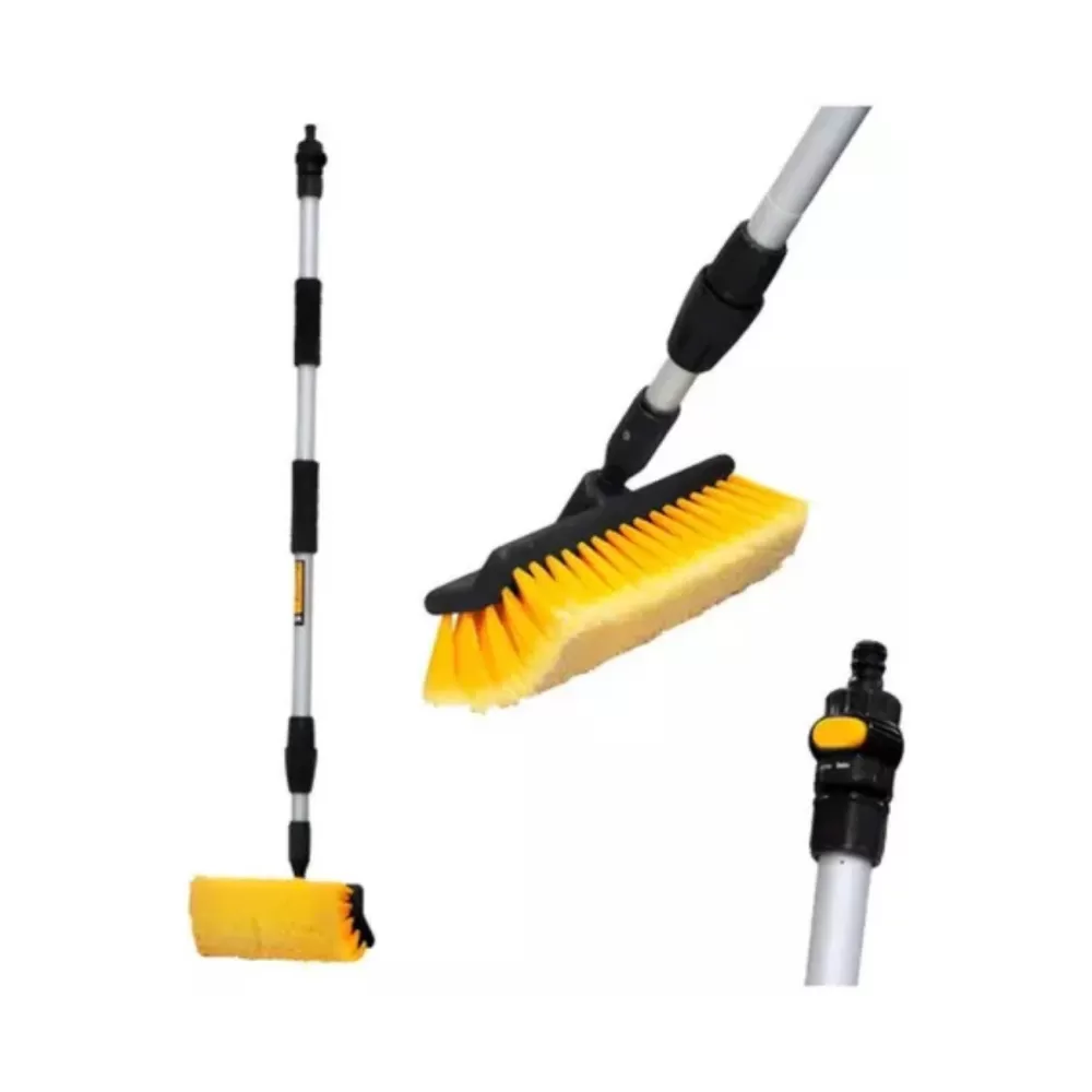 A vassoura extensível permite alcançar áreas mais altas e de difícil acesso sem a necessidade de uma escada, proporcionando mais conforto durante o uso. A entrada de água proporciona uma limpeza contínua e sem interrupções, ideal para superfícies externas como carros, calçadas, ou vidros.