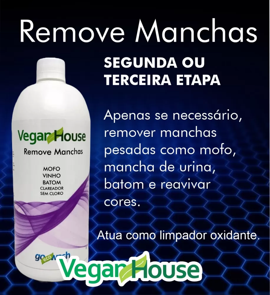 O REMOVE MANCHAS VEGAN HOUSE é um limpador de uso geral, tira manchas com grande poder de limpeza, clareia e as manchas mais difíceis, pela ação do Peróxido de Hidrogênio. Não possui cloro, odor suave e menos oxidante.